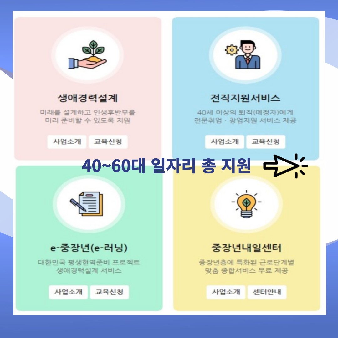 중장년 일자리지원센터는 40~60대의 중장년층을 위한 서비스를 제공하기 위하여 중장년 내일센터에서 퇴직 이전부터 퇴직 후 구직 활동까지 중장년층의 취업을 포함한 다양한 고용 지원 서비스를 제공하고 있습니다.