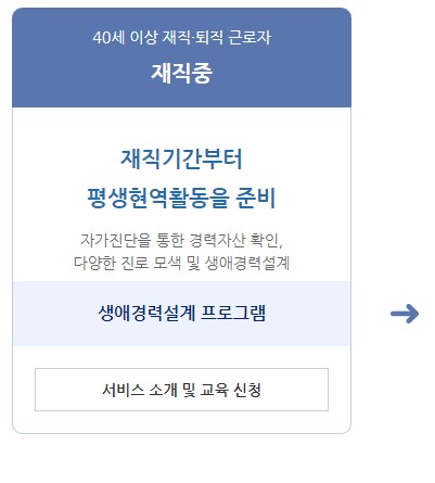 상자 40세 이상 대한민국 중장년 생애경력설계는 중장년의 생애경력설계를 위해 필수적으로 점검해야 할 요소들을 확인하고 이를 통해 장·단기 경력계획을 수립할 수 있도록 교육과 1:1 상담을 제공합니다.